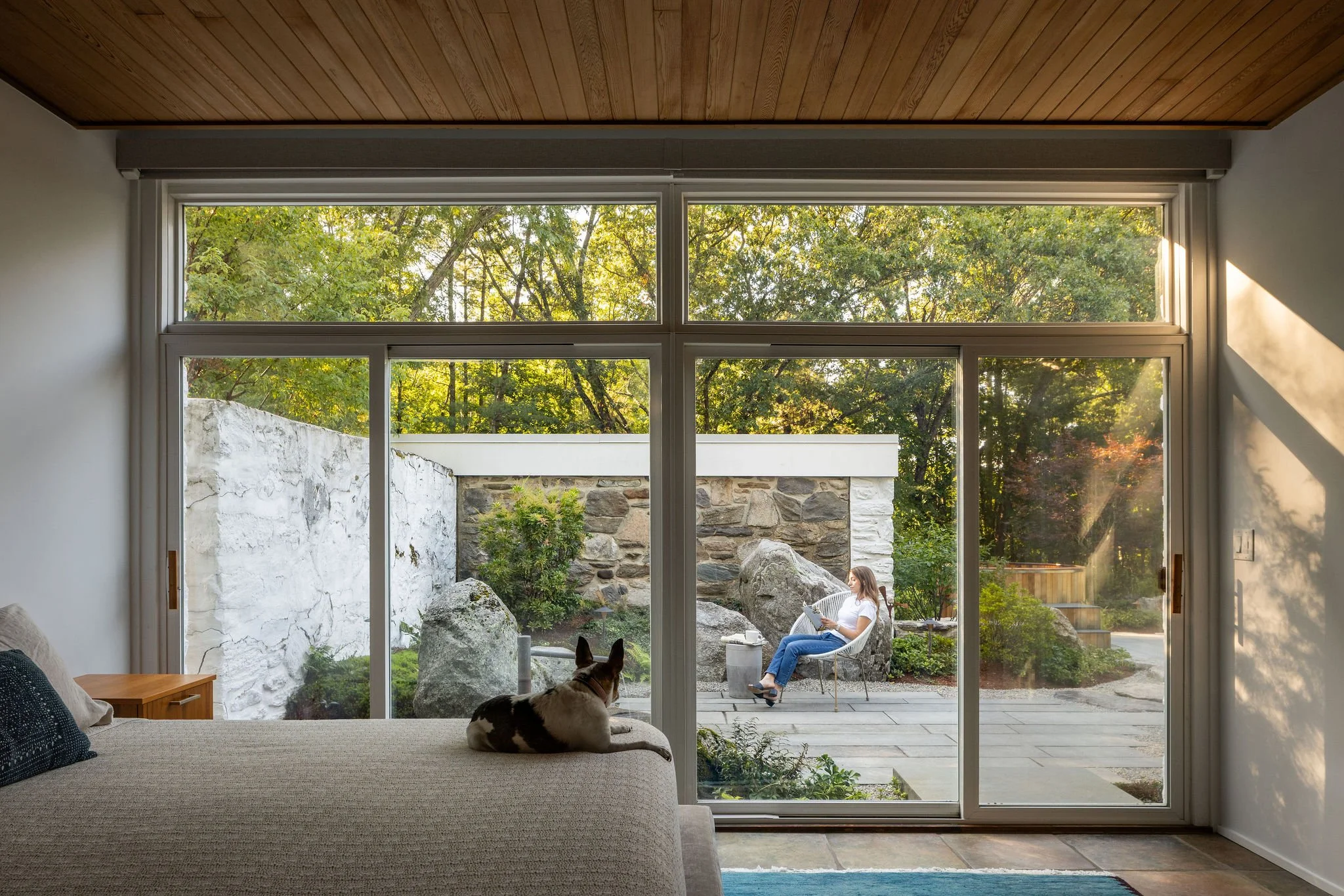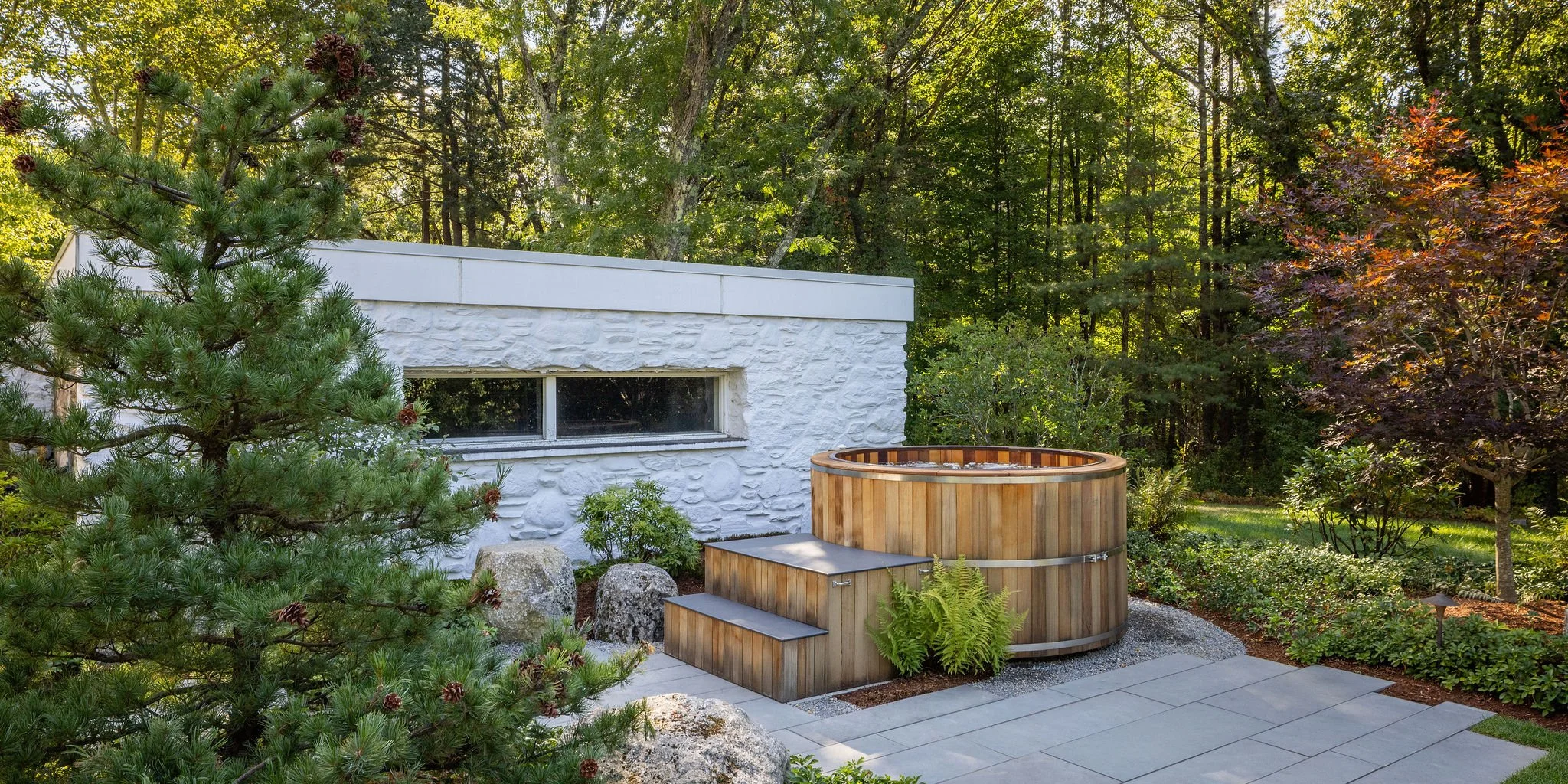 The simplicity of the design was created with a restricted palette that compliments the materials and color tones of the house. Orthogonal lines pull from the architecture out into the landscape, unifying the two. A metal runnel with stacked stone visually connects the front entry to the primary bedroom garden, while further highlighting a unique feature in Breuer’s architecture.