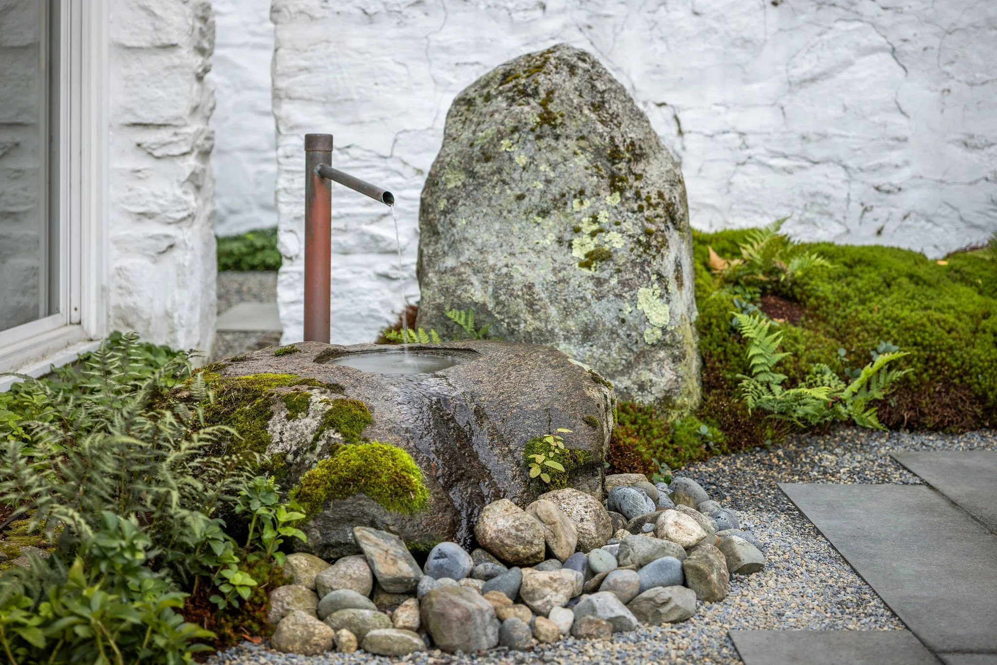 Moving to a space formed for privacy and respite, the zen garden off the primary bedroom offers an outdoor shower, water feature, and minimalistic planting. Arranged boulders, undulating moss plant beds, bluestone and gravel are mediums in which we used to paint a calming atmosphere extending from this unique home. To highlight the tranquil nature of the site, a boulder was hand carved to create a recirculating water feature that can be enjoyed from both the garden and primary bedroom. A wall of glass separates the bedroom from the spa-like garden, blurring the lines of architecture and landscape.